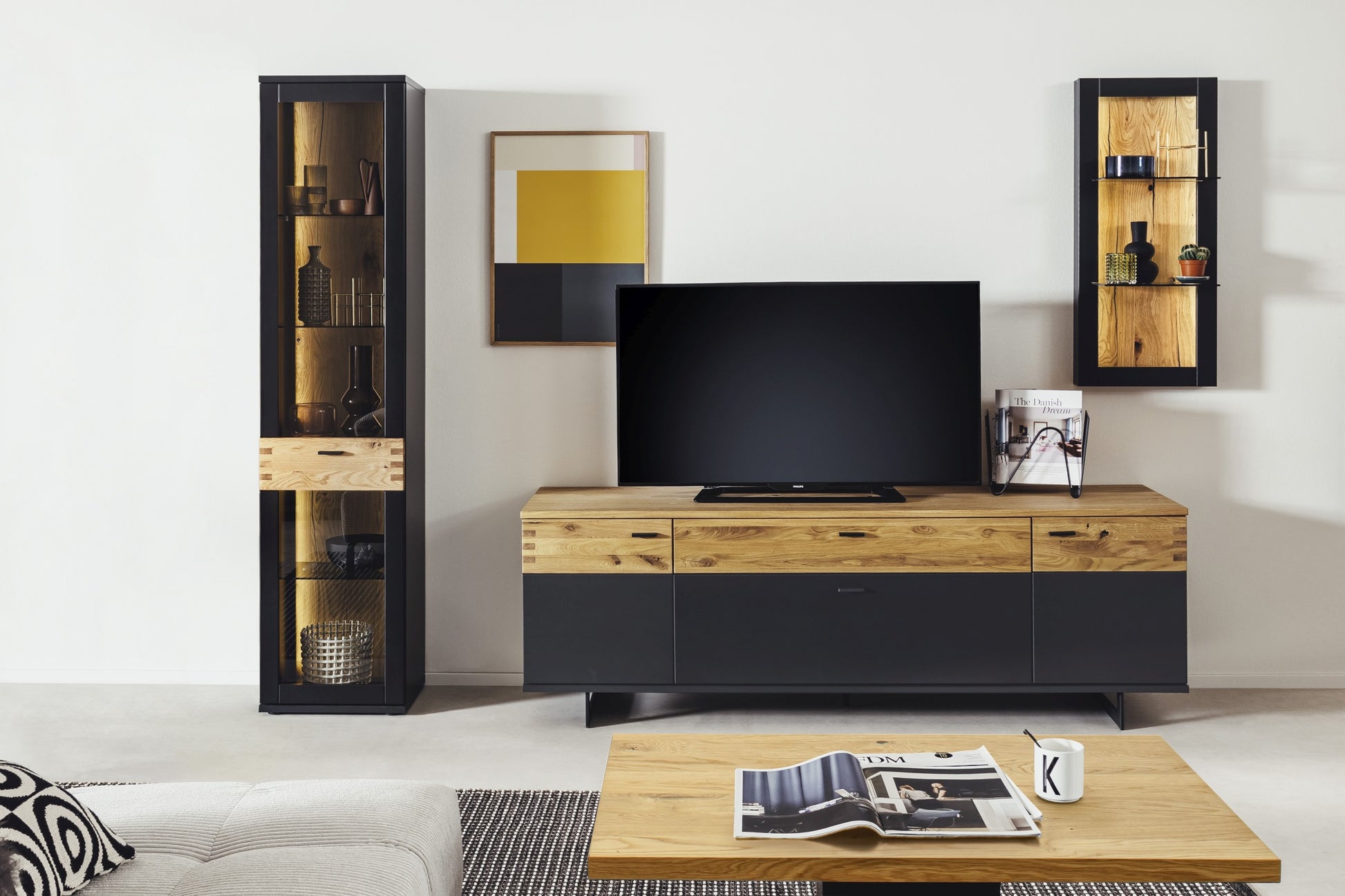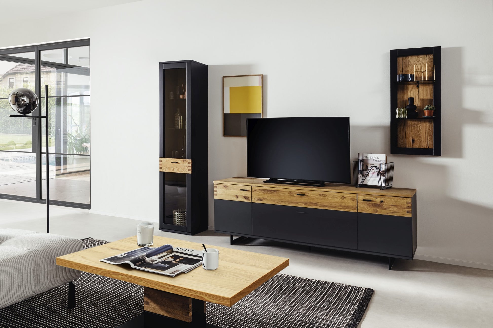 - Rückwand: sichtbar: Risseiche furniert, Oberfläche geölt hinter Türen & Schubkästen: schwarzgrau Dekor